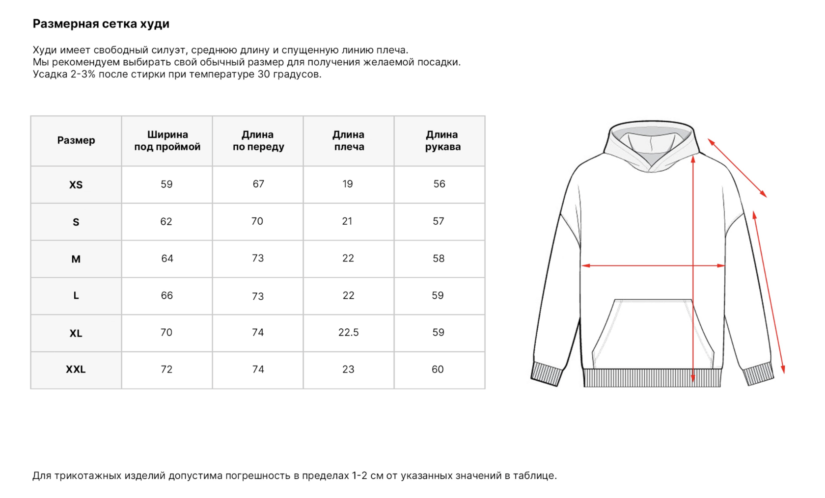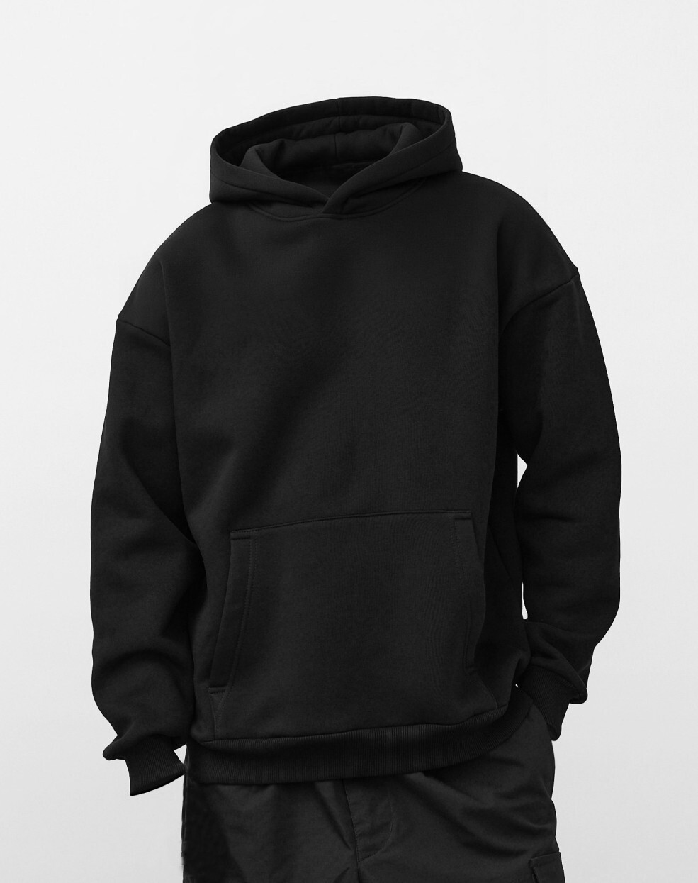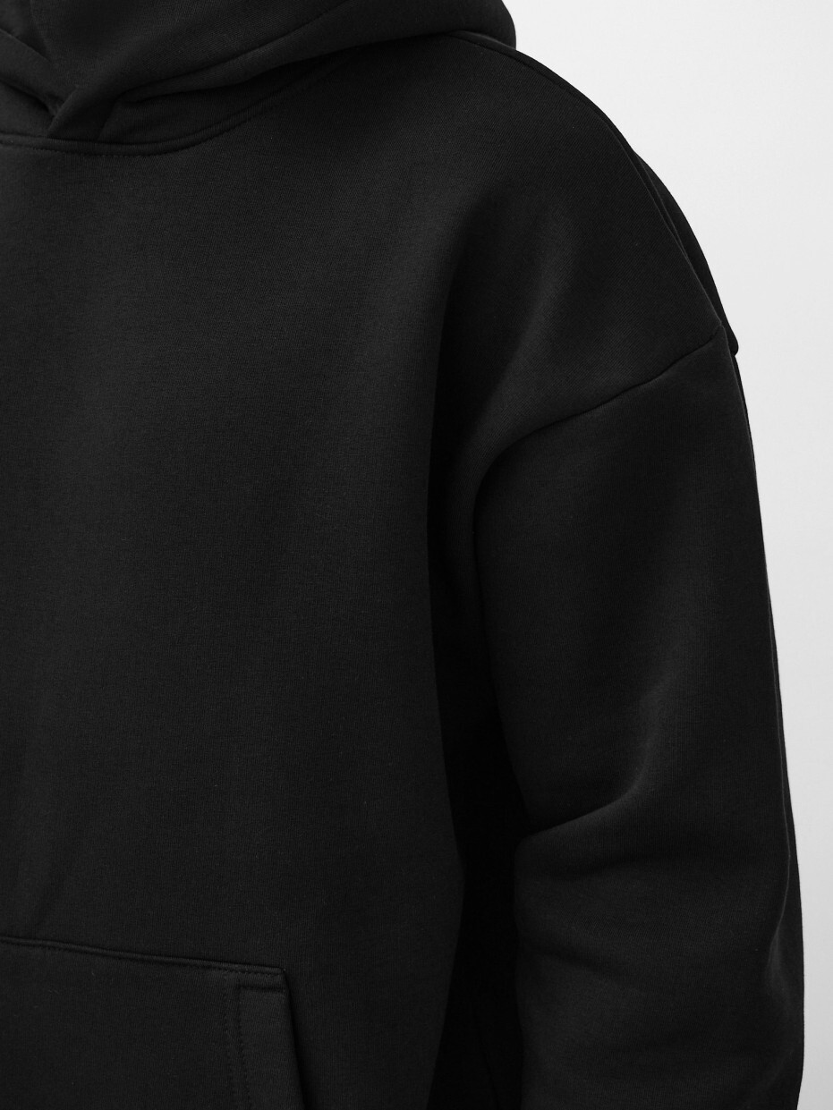 Плотность: 380 г Худи свободного оверсайз-кроя выполнено из футера с начёсом — плотного трикотажа с мягкой тёплой изнанкой. Модель отличается приспущенной линией плеча, средней длиной и ненавязчивым объёмом в силуэте. Пояс и манжеты связаны из кашкорсе — эластичной рифлёной резинки, которая хорошо держит форму.