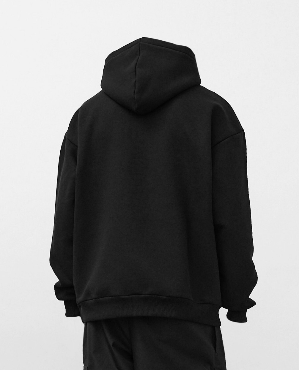 Горловина со стороны спинки укреплена хлопковой киперной лентой — это защищает швы от растяжения и продлевает срок службы изделия. В центральной части вшит чёрный тканевый жаккардовый размерник, а вдоль внутреннего бокового шва закреплён нейлоновый составник. Худи дополнено накладным карманом спереди. Капюшон намеренно выполнен без шнурка — в минималистичном и безопасном ключе.
